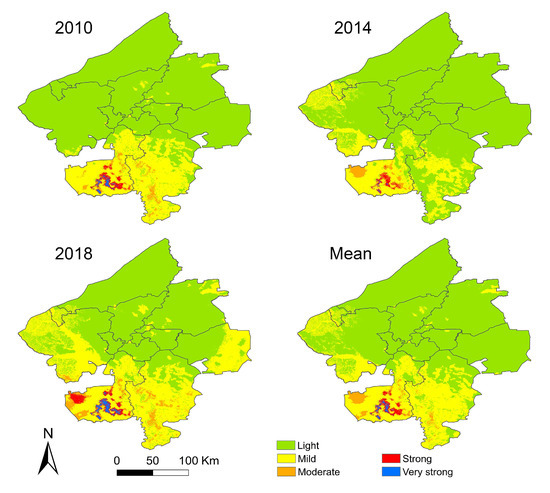 Wind erosion grade distribution in the northern Songnen Plain in 2010, 2014, and 2018.