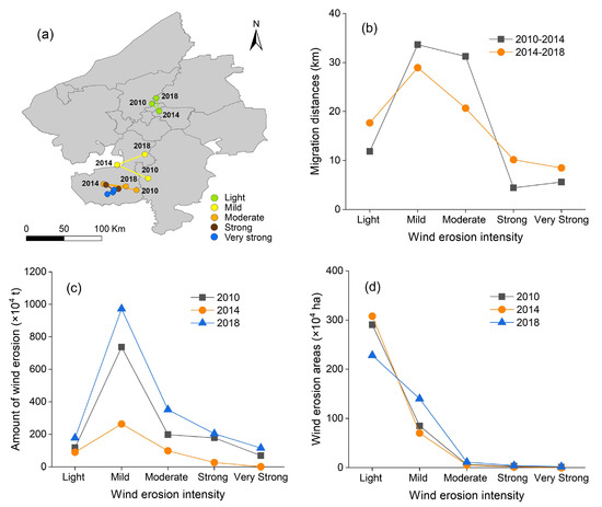 Gravity center migration (a), and characteristics of different grades of wind erosion (b–d).