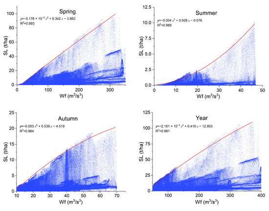 The layout and process of ecosystems are often affected by many factors, such as climate change and human activities. A scatter plot describing the correlation between ecosystem variables and influencing factors is usually displayed as a border scatter plot [38]. The constraint line method can effectively extract the boundary of the scatter plot, representing the constraint relationship between two variables. It provides an effective method for understanding the relationship between ecosystem variables and influencing factors. In this study, the ecological variable value range on the abscissa of the scatter chart is divided into 10 equal parts. The subsection quantile regression method plots the constraint line of wind, temperature, and rainfall response to wind erosion [39], and the 95% quantile was selected as the boundary point [38]. OriginPro 9 was used for regression analysis.