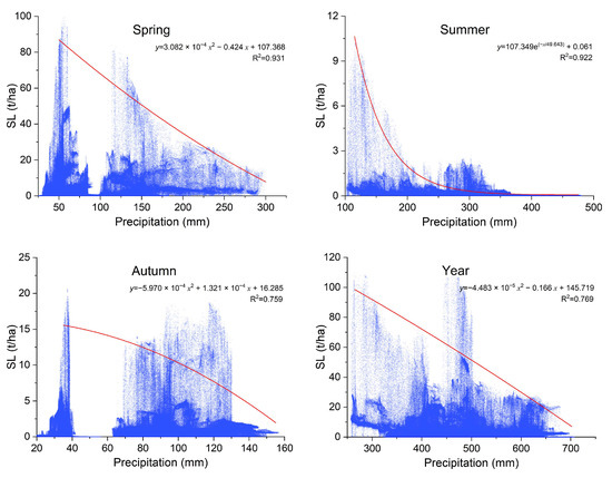 Wind erosion in the northern Songnen Plain is positively correlated with wind factors (Figure 7). Wind erosion increased with wind force. Spring is the primary season for wind erosion due to the stronger wind force, indicating it is necessary to monitor the wind speed in spring in the study area and take effective measures amid higher wind speeds. In general, precipitation is negatively correlated with wind erosion (Figure 8). Heavier rainfall led to a smaller amount of wind erosion. Although the rainfall in spring in the study area is not low, the wind erosion in some regions is still intense due to strong wind and uneven rainfall distribution. The wind force is weak in summer and autumn, and the wind erosion is generally light. Temperature is another important factor affecting wind erosion. Results show the temperature in each season is positively correlated with wind erosion. The higher temperature is accompanied by stronger wind erosion, indicating a relationship between them (Figure 9). When the average temperature in spring is higher than 12.5 °C, the wind erosion amount increases rapidly, suggesting that prevention and control measures against wind erosion should be strengthened. In sum, in the northern Songnen Plain, wind erosion is correlated positively with wind force and temperature, and negatively with precipitation.