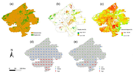 Windbreak and sand-fixation service function in the northern Songnen Plain. (a) The supply regions and demand regions; (b) the supply rate; (c) the demand degree; (d) the flow direction (arrow direction) and flow velocity (arrow color and size); and (e) the flow volume (arrow color and size). For panels (a–c), a spatial resolution of 250 m × 250 m is used. For panels (d,e), a 20 km × 20 km spatial resolution is adopted.