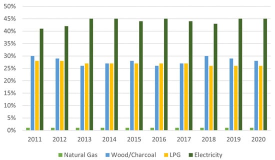 In Brazil, energy consumption in the residential sector relies on electricity, wood, and liquefied petroleum gas (LPG), with a crescent use of natural gas, according to the Brazilian Energy Balance—2020 report [1]. By 2020, this particular sector consumed 10.8% of the total energy supply in Brazil, only ahead of the agribusiness and services sectors. Figure 1 illustrates how these energy resources have slightly changed over the last decade, with a strong presence of renewable energy share (67%) due to electricity generation based on renewable resources such as hydro, solar, wind, and biomass.