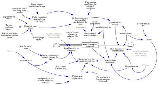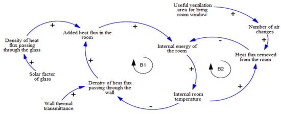 A causal diagram depicts a reduced representation of causal links and mathematical equations to facilitate the understanding of the variables’ evolution and their interconnected rationale. As can be seen in Figure 4 (made with the Vensim software PLE 9.0.1x64 version), there are two negative balancing loops (B1/B2), whose functions are to smooth the internal thermal energy inside the room, which is directly related to the internal room temperature. Loop B1 is related to the heat flux that passes through the wall and window glass, while Loop B2 considers the heat flux removed from the room by the number of air changes through the window opening.