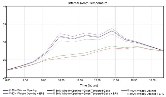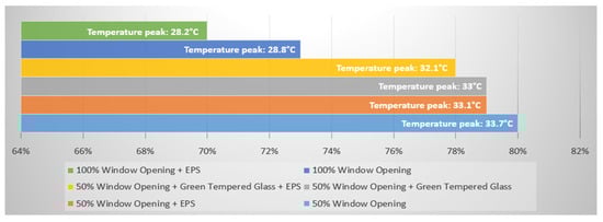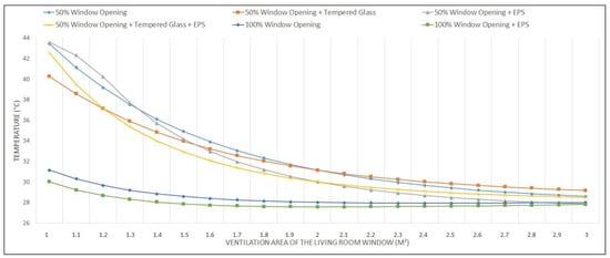 Compared to the MCMV standard window size (1.78 m2), it is observed that the smallest window area (1.00 m2) provides the highest peak temperature in the room for all scenarios, as a direct result of less airflow volume and air exchange. In this case, a smaller window can raise the internal room peak temperature close to 11 °C (“50% Window Opening”, “50% Window Opening + EPS”, and “50% Window Opening + Tempered Glass + EPS” scenarios). With a 2.00 m2 window area, a temperature decrease of up to 3 °C is detected in the “50% Window Opening + EPS” scenario, while others remain lower than a 1 °C drop. When a 3.00 m2 window area is applied, almost 5 °C is withdrawn from the room temperature, shown in the “50% Window Opening” and “50% Window Opening + EPS” scenarios.