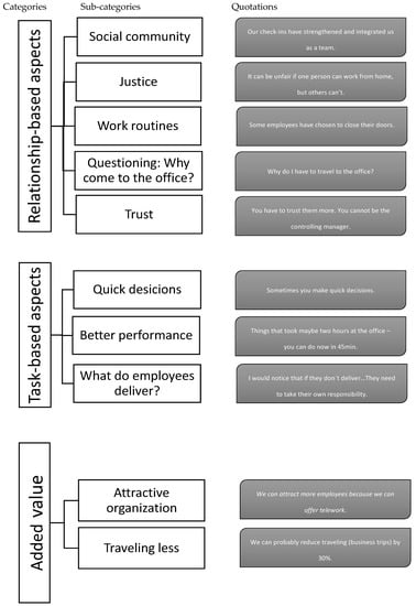 - Comparison: Different statements were compared to identify sources of variations (e.g., “Some employees have chosen to close their doors. They have started to do so or to sit at home so that they can work in peace” and “Some employees say: could we have meetings at the office?”). In addition, the essence of the similarities was classified (creating different sub-categories, e.g., work routines).