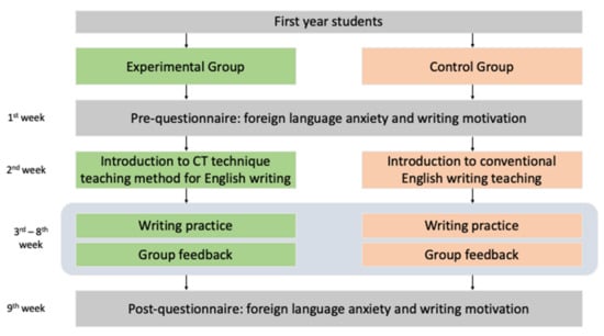 The participants of this study were 58 first-year high school students enrolled in an English writing course. Demographically, the group was composed of 16 males and 13 females for the experimental group, and 14 males and 15 females for the control group, with an average age of 16. The course was designed to assist K-12 students in developing their English writing abilities. For the quasi-experimental design, students in one class were designated as the control group, and those in another class were designated as the experimental group. The same assessment and course materials were assigned to both classes, but different instructional strategies were employed for the experimental and control groups. The students in the control group were taught English writing according to standard teacher-centered training, whereas those in the experimental group were taught English writing in accordance with the fundamental concepts of CT. These concepts constitute a novel form of writing instruction. The same teacher with more than ten years of teaching experience taught both classes. Before the experiment, the teacher and a professor who had studied CT discussed the lesson plan for incorporating the fundamental concepts of CT into English writing training.
