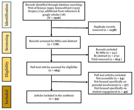 This study systematically reviews the published literature on the empirical studies of parental involvement and student engagement in the past two decades. A systematic review was chosen because it addresses questions that individual studies could not, it summarises the state of knowledge in an area from which future research goals may be defined and it identifies the research that should be fixed in future studies [26,36]. Therefore, we opted for a systematic review approach to better understand how research on parental involvement and student engagement was conducted. The review was conducted following the Preferred Reporting Items for Systematic reviews and Meta-Analyses [37] (PRISMA) framework. Overall, three topics, including (1) the landscape of studies, (2) methodological issues (i.e., conceptualisation and measurement), and (3) patterns of previous studies of parental involvement on student engagement, were included in the literature review.