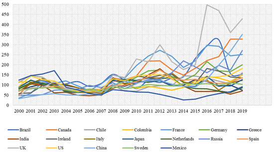 EPU has risen over time in industrialized and developing nations over the past 20 years [38]. Figure 2 displays the trends in EPU in selected developed and developing economies. The trends show that EPU has been increasing across the countries in the current panel. One of the key causes is the growing interconnection of economies worldwide, which has increased sensitivity to outside political and economic shocks. The interconnectedness and growing complexity of the world’s financial markets have also raised uncertainty. Increasing political polarization and volatility in many nations is another factor that has contributed to increased policy uncertainty, particularly about topics like trade [39,40], immigration, and regulation. As a result, protectionist policies have become more prevalent, and financial markets are now more volatile [41]. Natural disasters’ growing frequency and intensity, as well as the effects of climate change, have increased uncertainty in some countries over decisions regarding energy, infrastructure, and climate change policies [42]. Finally, when governments adopted unheard-of policy measures to restore their economies and financial systems, the 2008 financial crisis and the subsequent global recession also contributed to economic policy uncertainty. Markets in Europe, China, and Japan suffer from policy uncertainty in the US [43].