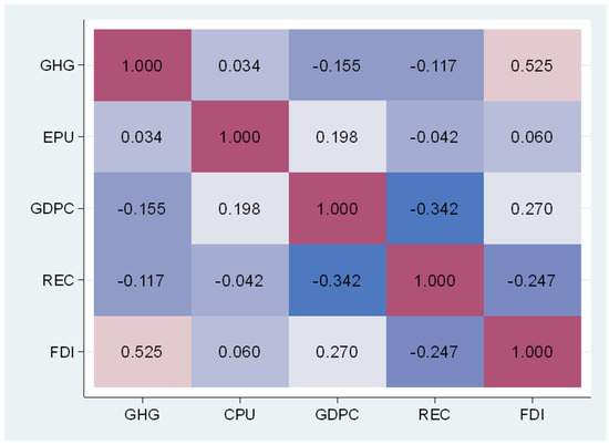 Bias-corrected-Q(p) test [68] results (Table 1) show that there might be a serial correlation as Q(p) test statistics are significant at lag 1. Similarly, the Q(k) test [68] is also significant, with a p-value < 0.00 for all variables at order 1, which confirms the presence of serial correlation. However, the heteroskedasticity-robust [68] HR test shows that the HR statistics for LGHG and LREC are significant but insignificant for LEPU. Moreover, the HR test values for LGDPC and LFDI are significant at the 0.10 level. The CIPS [72] values of LGHG, LEPU, LGDPC, LREC, and LFDI are −3.436, −2.75, −2.939, −2.956, and −3.214, respectively, which is less than the 5 percent critical value of −2.73, confirming that the second-generation test rejects the null hypothesis of a unit-root process for the variables. The results of the slope homogeneity test (Table 1) show that the null hypothesis could not be rejected for LGHG, LEPU, or LGDPC. However, the null hypothesis for the variables LREC and LFDI is the Delta and Adj. Delta values are significant at the 0.01 level. The Wooldridge test for serial correlation [66] strongly rejects the null hypothesis of no 1st order serial correlation. The LR χ2 test proved the existence of heteroskedasticity with a p-value of less than 0.01. The low correlation coefficients among the independent variables in the model, as shown by the correlation heat map in Figure 3, imply that multicollinearity is not an issue. Moreover, the Mean VIF is less than 5, proving that multicollinearity was not a problem.