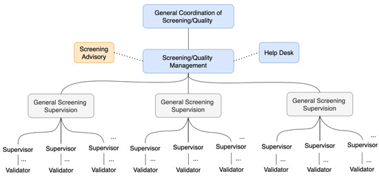 Figure 3 depicts the organizational diagram used to guide the process of textbook validation and triage in PNLD. The process is led by two general coordinators of triage/quality, two triage advisors, two triage/quality managers, one help desk supervisor, one team supervisor, and a set of validators for each team. However, the number of teams and validators depends on the currently published public call for books, which is a formal document that presents a set of rules required to be followed by publishers of textbooks. Each public call for books is published for a specific object (a type of material) in a call for books.