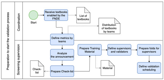 Figure 4 illustrates a flow diagram presenting an overview of the internal process for the validation and triage of books and other digital didactic materials in the PNLD for coordinators and triage supervisors. Four main artifacts are generated using spreadsheets and text editors: a list of textbooks under validation, a list of textbooks distributed to teams, a list of attributes used during evaluations, and supporting materials. The process starts when the general coordinator receives the textbooks from the FNDE. Afterward, the coordinator and triage supervisor define metrics (e.g., number by teams) and distribute the textbooks to each team. The triage supervisor also analyzes the public call for books, prepares a checklist for validations, and creates training materials for validators. They also assign validators to teams and specific supervisors, set up Google Drive folders for each supervisor, and define the validation schedule.