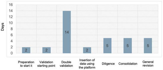 Figure 5 illustrates the reduced time required to complete tasks (another relevant problem). It also provides an overview of high-level process tasks: (1) preparing the resources required to start the process (preparation to start), (2) conducting tasks required before starting double validation (validation starting point), (3) conducting double validations (double validation), (4) inserting validation data into an online validation platform used by publishers and validators, known as PNLD Digital (insertion of data using the platform), (5) requesting and monitoring diligence (diligence), (6) consolidating validation results (consolidation), and (7) reviewing overall results (general review). The most time-consuming task is double validation; however, unexpected situations during the internal process usually delay other tasks.