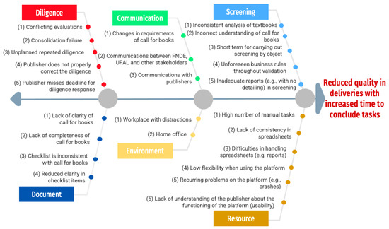 The Ishikawa diagram is considered a relevant approach to support quality management activities due to the possibility of a precise diagnosis of problems. This approach has been applied in a variety of domains, such as healthcare [15], production [16], and education [17].