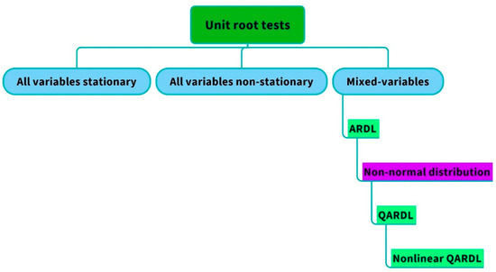 In this study, we use a technique called QARDL to analyze the data. To explore the long-run and short-run asymmetries among concerning variables, we have employed the QARDL technique proposed by Cho et al. [35]. The QARDL approach is dominant in linear models, for several reasons. The first advantage of adopting this technique is that it takes into account the locational asymmetries in which factors and findings may be conditional on the dependent variable. For this reason, QARDL is considered more appropriate, as the linear ARDL technique cannot capture the asymmetric association among variables. Another advantage is that the QARDL approach considers the long-run dynamics as well as short-run dynamics over different quantile ranges. The QARDL methodology is a scientifically sound approach to modeling non-stationary time series data with structural breaks. The latest literature uses QARDL to investigate a wide range of economic and financial phenomena [36]. The use of the nonlinear QARDL approach is a relatively new and advanced technique for analyzing time series data (see Figure 1). QARDL is considered a workhorse approach in energy economics; it has several advantages and potential applications. Depending on these trustworthy sets of data, it is shown that the QARDL approach is the most efficient at comprehending the asymmetric connection between renewable energy demand and its privatization, ICT diffusion, economic development, and financial development. The basic model is: