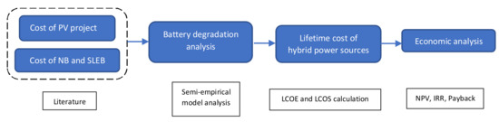 This section demonstrates the research methodology for the feasibility study of PV-SLEB for EV charging applications. To start, the costs of PV and new lithium-ion batteries obtained from China’s PV cost prediction including engineering, procurement, and construction costs are implemented in this study [9]. To eliminate consumer concerns regarding untraceable SLEBs purchased from suppliers and to lengthen the battery life cycle, the retired battery in the driver’s EV is utilized as a SLEB [12]. Once the battery passport project is released, the SLEB in the market may be used with confidence [35]. Based on the Nissan Leaf EV used in this study, the approximate cost of the SLEB at USD 44/kWh is used in this study for the first year of evaluation [36]. For the consecutive year, the reduction tendency factor of an NB is applied for the prediction cost of the SLEB from the year 2023 to the year 2031. To consider the useful life of the battery during the use phase, the battery life degradation evaluation of the NB and SLEB has been incorporated using the semi-empirical degradation model-based technical analysis under DOD variants. Next, LCOE and LCOS are used to calculate the lifetime costs of alternative energy production. Finally, the revenue received from hybrid power sources using NB and SLEB is economically assessed for the project’s viability based on the NPV, IRR, and payback period. Figure 1 depicts the flow of the proposed study.
