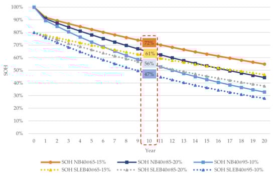 In this aspect, the semi-empirical models are acceptable in our study. The charge and discharge profiles, as well as the temperature, have a symmetrical profile within an operation period, i.e., the battery is charged during the day from 20 to 90% SOC at 35 °C and discharged to the EV from 90 to 20% SOC at 25 °C; thus, the SOC and temperature average are same value used in both calendar and cycle aging calculations. This work keeps the battery’s charge and discharge currents at 1 C to retain its operating temperature, as well as the study’s average ambient temperature of 30 °C. We investigate battery deterioration over a range of SOC operating windows for both an NB and SLEB in order to predict life fading for economic evaluation. The different SOC windows for batteries are 65–15% (50% DOD, 45% ), 85–20% (65% DOD, 52.5% ), and 95–10% (85% DOD, 52.5% ). The varied DODs simulate user behaviors in a real-world driving situation where each driver could have distinctive charge preferences that differ from the others.