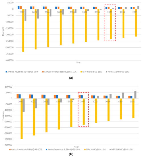 In addition, the designer might check to verify if energy is available within the timeframe indicated; otherwise, the project may not be implemented properly. It is obvious that a SLEB has a competitive advantage over an NB in terms of lower investment and faster payback, both of which contribute to project viability. With a SLEB of about USD 40–50/kWh, it has been found that the IRR is still by far the MLR. This is a good option for those who want to implement this project.