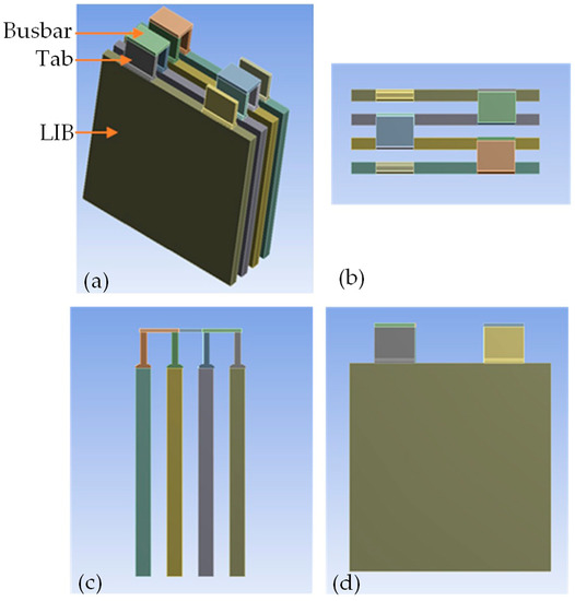 The LIB module used in this study consists of four LIBs, as shown in Figure 1. The configuration of the LIB module is based on 4S1P (four LIBs in series and one LIB in parallel). Each of the LIBs is connected to two aluminium tabs (positive and negative connections). These tabs are connected via copper busbars to form the LIB module. In total, the sub-components of the LIB module are four LIBs, eight tabs, and three busbars. LIBs are spaced by 5 mm gaps for the cooling medium. The properties of the LIB and tab and busbar are shown in Table 1 and Table 2, respectively.