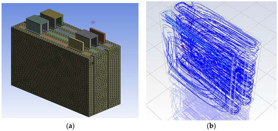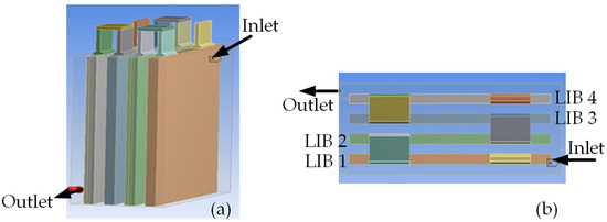 LIB module and LIB module enclosure of (a) complete mesh and (b) flow field of cooling medium.