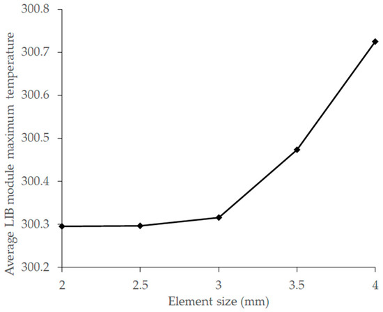 The LIB module enclosure is meshed using tetrahedral elements due to its complex geometry and to avoid any distortion. For the LIB module, hexahedral elements are used with four different element size refinements. Four simulation iterations are run based on the full depletion of the LIB module. The element sizes are set between 2 and 4 mm, with 0.5 mm intervals. The average LIB module maximum temperature is plotted against the number of elements.