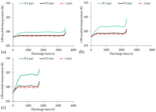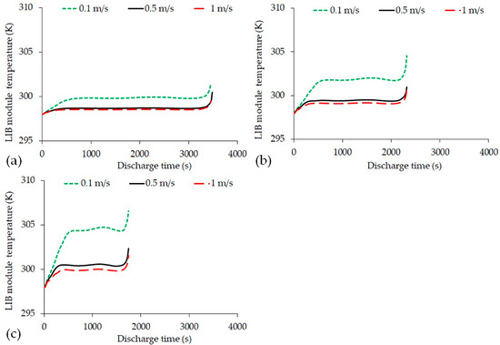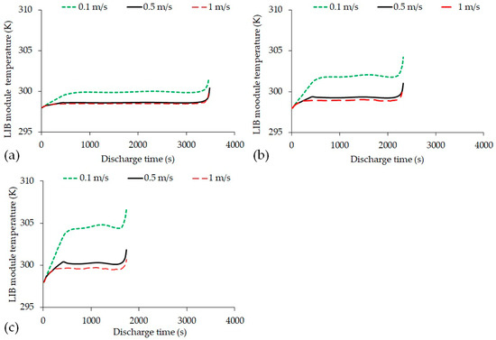 The constant behaviours of the maximum LIB module temperature at all discharge rates are significantly improved compared to the inlet velocity of 0.1 m/s, which indicates that the inlet velocity is governed by the heat transfer process between the LIB module and to N-Pentane cooling medium, as shown in Figure 5. One can see that using N-Pentane as a BTMS liquid coolant (LC-BTMS) successfully maintains the LIB module temperature at a constant level within 80% of the total discharge time. This constant temperature behaviour can help to maintain the state of health of LIBs in the long run [10].