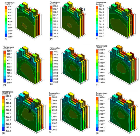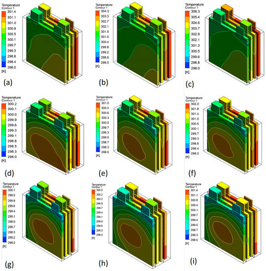 The temperature contours of the LIB module are illustrated in Figure 8, showing all nine cases of discharge rates and inlet velocities, (a) 1C at 0.1 m/s, (b) 1.5C at 0.1 m/s, (c) 2C at 0.1 m/s, (d) 1.5C at 0.5 m/s, (e) 1.5C at 0.5 m/s, (f) 2C at 0.5 m/s, (g) 1C at 1 m/s, (h) 1.5C at 1 m/s, and (i) 2C at 1 m/s. For instance, at 0.1 m/s and 2C, the LIB module temperature is more homogenous than that of FAC-BTMS, with a 148.4% (4.416 K) less temperature difference. Although using N-Pentane as a coolant showed promising results, using N-Hexane as a coolant further reduced the temperature difference by almost 2.2 °C.
