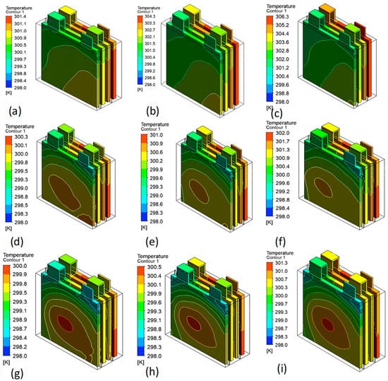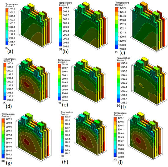 LIB module temperature distribution with N-Pentane LC-BTMS at (a) 1C at 0.1 m/s, (b) 1.5C at 0.1 m/s, (c) 2C at 0.1 m/s, (d) 1.5C at 0.5 m/s, (e) 1.5C at 0.5 m/s, (f) 2C at 0.5 m/s, (g) 1C at 1 m/s, (h) 1.5C at 1 m/s, and (i) 2C at 1 m/s.