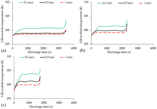 The LIB module temperatures at three inlet velocities versus discharge time are presented in Figure 7, based on the three discharge rates, (a) 1C, (b) 1.5C, and (c) 2C. As can be seen from the figure, the results show similar trends to those shown for N-Pentane LC-BTMS. The constant temperature behaviour occurs during the first 80% of the full discharge time.