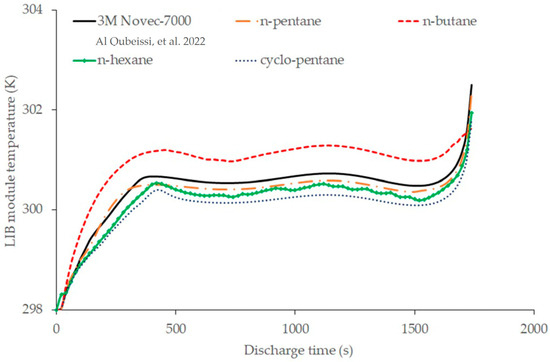 Also, it is noted that N-Pentane, N-Hexane, N-Butane, and Cyclo-Pentane produce an average temperature difference of −0.101 K, −0.232 K, 0.490 K, and −0.380 K, respectively, below that of 3M Novec-7000 LC-BTMS. Additionally, all fuel component LC-BTMSs are able to maintain the temperature difference between LIB cells below 5 K.