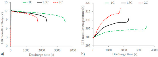 To verify the accuracy of the CFD model, FAC-BTMS is compared with the previous work performed by [33]. Table 8 shows the LIB temperature behaviour of the module and cells at three discharge rates. As shown in Figure 14, 1C, 1.5C, and 2C require 3480 s, 2340 s, and 1740 s, respectively, to fully deplete the LIB module.