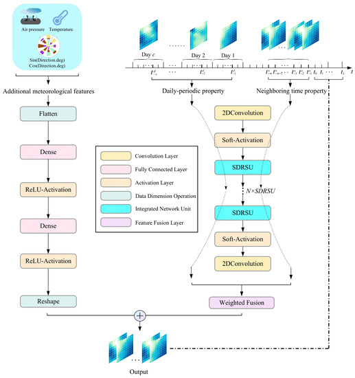 Wind speed time series are naturally correlated with neighboring series and exhibit a certain periodicity. The wind speed of the next moment is highly correlated with previous wind speed. Based on the above two characteristics, we divide the wind speed series into neighboring time property and daily periodic property. These two temporal properties are modeled separately, and spatial features are extracted from the corresponding properties through a series of convolutions of the temporal property slices. This output is then fused using the fusion matrix method in order to extract spatio-temporal features. As illustrated in Figure 7, the proposed model for processing data and the change in the data’s dimension is described. Firstly, the selected time-slice information is decomposed into a series of feature maps through a convolution operation, followed by a soft-activation operation. Feature maps obtained are fed into SDRSUs which are designed for extracting features and reducing noise. The feature maps are mapped back to 1 × 10 × 10 using soft activation and convolution.