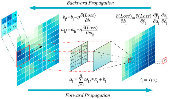where is the weight of the convolution kernel, is the input value, is the bias, is the defined loss function, is the learning rate, is the output of forward propagation, represents the expected value, represents the intermediate variable in the propagation process, represents the number of output unit nodes (only single nodes are discussed in this example), and is the activation function. ReLU is commonly used in classical residual networks as a function of activation. When the activation function is ReLU and the loss function is defined using MSE as mentioned above, the back-propagation process of (3) is transformed as: