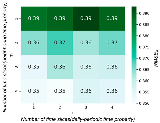To obtain the dataset for the model, Gaussian noise and Laplace noise with different distributions were added to the original data set. The dataset was divided into a training set, a validation set, and a test set. An early termination iteration condition was set on the validation set, and a fixed number of 100 iterations was performed after the training process satisfies the early termination. The model uses the Adam optimization algorithm [32]. The learning rate is selected as 0.0002 using multiple adjustments. The model has a large number of hyperparameter settings. The number of all convolutional kernels in the model is chosen to be 128, and the convolutional kernel size is 3 × 3; the lengths of time slices and for each time property and the number of residual units superimposed in the network are determined by several experiments. The confirmation experiments of hyperparameters in this paper are based on April to June of dataset 1, and the model parameters of dataset 2 are kept consistent with the parameter settings of dataset 1. The final hyperparameters were determined as , , and the number of residual units is determined as 4. The experimental results are shown in Figure 10 and Figure 11.