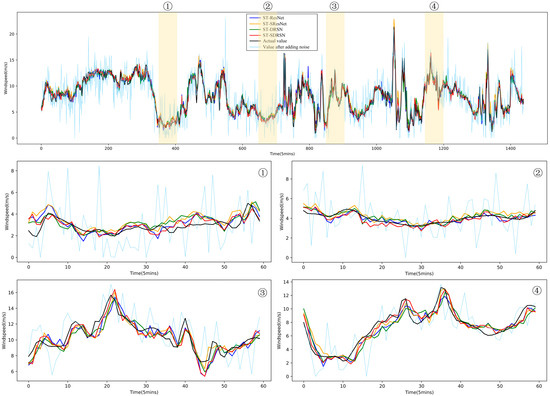 As part of our evaluation of the ST-SDRSN, we compared it to models such as LSTM, CNN-LSTM, and CNN-GRU that predict wind speed. Due to the different time processing modules and model architectures, we compared these four models individually, as shown in Table 4. In the case of noise D, the prediction accuracy of the ST-SDRSN model is 34.49%, 9.46%, and 10.89% higher than that of the traditional LSTM, CNN-LSTM, and CNN-GRU models, respectively.