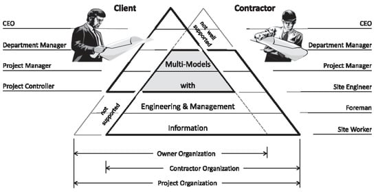 The architecture, administration, and combining of distributed application models in multi-models also represent a significant problem. One or more application models are employed across the engineering and managerial domains of the construction industry. The multidimensional information space of a project is defined by the total of its application models, with each domain standing for a different dimension. Data interchange between AEC/FM disciplines and project stages must be compatible in order for the project information from this model space to be reused. Additionally, data must be appropriately converted for use in decision making at various management levels of the project organization. As shown in Figure 7, the management levels of the owner and contractor organizations make up the primary decision hierarchy of a construction project.