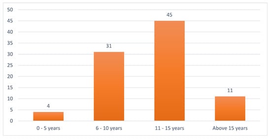 Only 4 respondents had experience between 0 and 5 years, whereas 31 respondents had experience between 6 and 10 years; a total of 45 respondents, 11–15 years; and 11 respondents, more than 15 years.