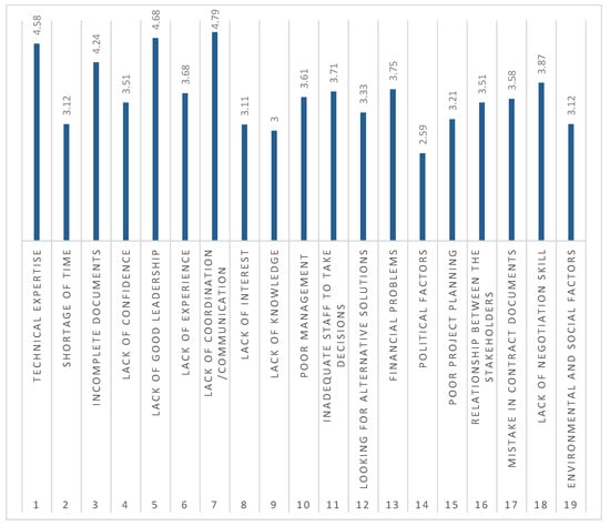 The first important observed factor was technical expertise. In the construction industry, the lack of technical expertise in management to make timely decisions is a significant problem. Technical expertise is based on knowledge, information, data, assessment reports, frequent internal meetings, and regular visits to the construction site to get updates and inquire about the issues and factors that cause project delay [74,75]. The collective information can help to timely make decisions to resolve pending cases and maintain the flow of construction activities.