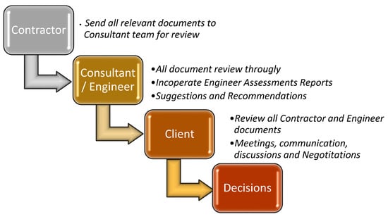 In the following, suggestions and decision process improvement actions are investigated. The results of Phase 1 highlight that the client has a crucial role in timely decision making in construction projects. Proper and timely decision making is a fundamental action in any project. The client should be briefly and timely informed about the issues of the project so that the client can make timely decisions [81]. The client implements the decision-making process to be followed by all the stakeholders to make correct and timely decisions [82]. The government sector can implement the decision-making process to be followed by all stakeholders (contractors, consultants/engineers, and clients) in the construction sector. The process indicates the right path and directions to make the right decision at the right time, as shown in Figure 12.