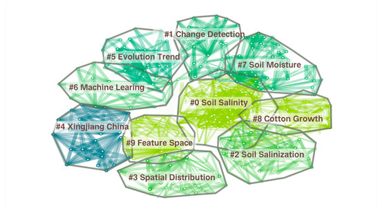 The literature in CNKI and WOS databases was searched based on the similarity of literature keywords. A keyword clustering analysis was performed on the retrieved literature datasets related to soil salinity monitoring (Figure 3 and Figure 4). Keyword clustering analysis is the process of analyzing the set of keywords extracted from the literature into multiple categories consisting of similar objects. There are many different algorithms for clustering analysis, and this study chose Logarithmic Likelihood Ratio (LLR) as the base calculation for the analysis. The labels of each cluster are the key keywords in the co-occurrence network. Based on this, closely related keywords are clustered. The higher the ranking of the cluster number, the more keywords are included in the cluster. Conversely, the more backward the ordinal number, the fewer keywords are contained in that cluster. The modularity value of the clustering metric Q ranges 0–1. The larger the value, the better the clustering effect. Usually, when Q is less than 0.3, it indicates that the literature data set analyzed by this clustering is not well structured. In Figure 3, a value of Q = 0.8293 was obtained from cluster analysis of the literature in the CNKI database. In Figure 4, a value of Q = 0.7128 was obtained from cluster analysis of the literature in the WOS database. This indicates that the data collected in the Chinese literature database and the international literature database were reliable and the keyword clustering analysis structure was significant.
