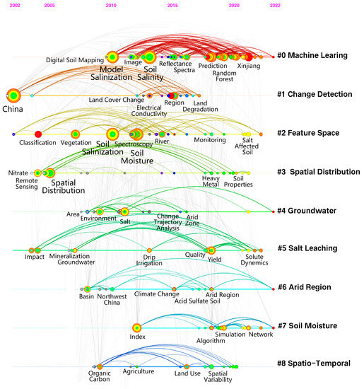 Keyword timeline mapping based on the literature related to soil salinity monitoring in the CNKI database from 1981 to 2022.