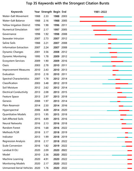 In recent years, countless domestic and international researchers have created many additional soil salinity monitoring techniques by tirelessly decoding an enormous amount of sensing image data. Keyword burst detection analysis was performed in CiteSpace software using the retrieved literature dataset related to soil salinity monitoring from 1981 to 2022 obtained by searching in the CNKI and the WOS databases (Figure 7). This analysis can be used to detect large changes in the number of citations of keywords in the literature during a certain time period. Thus, it helps to obtain the latest information on the frontiers of research in the field. The keyword burst detection mapping shows that since the information extraction and dynamic monitoring of salinized soil, many researchers have started to focus on the construction of models for soil salinization information by remote sensing. For example, “classification” appeared in 2012, “feature space” appeared in 2013, “quantitative models” appeared in 2015, “neural networks” and “random forest” appeared in 2016, “methods plsr” appeared in 2018, and “model”, “machine learning”, and “monitoring models” appeared in 2020. Among the 35 main keywords obtained from the analysis, a variety of keywords related to remote sensing monitoring modeling studies have begun to appear frequently in the last decade. These modeling studies are updated quickly and span a long period of time, and all of them have gradually achieved valuable research results while broadening the methods of soil salinity monitoring. This indicates that modeling studies have become a hot method in remote sensing monitoring of soil salinity.
