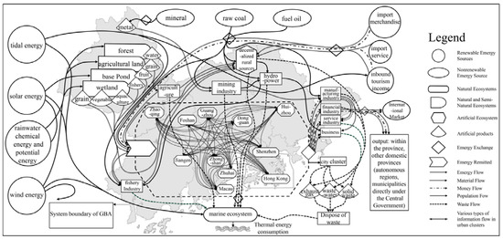 The ecological and economic system of the GBA is mainly composed of forest ecosystems; freshwater ecosystems such as wetlands, rivers, and basin ponds; marine ecosystems; agricultural ecosystems; rural ecological and economic systems; and ecological and economic subsystems such as cities, towns, and villages, while eleven cities consisting of Guangzhou, Shenzhen, Hong Kong and Macau and their surrounding towns and villages together constitute a collection of interrelated and coupled city clusters (Figure 1). In the system, in the form of emergy flow, renewable emergy sources such as solar emergy, wind emergy, potential emergy, and chemical emergy from rainwater, as well as geocyclonic emergy, are absorbed by forests and water ecosystems; nonrenewable emergy sources such as raw coal, fuel oil, and tidal emergy form water and electricity to supply the city clusters, for rural production and living, and for manufacturing and other industries. In the form of material flow, the population flow and monetary flow from decentralized rural sources are invested into the system. Based on the form of material flow, agriculture, fishery, animal husbandry, and other industries produce grain, aquatic products, meat, fruits, and vegetables to supply to city clusters, towns, and cities, and even for export to provincial, foreign, and international markets. Nonrenewable resources such as minerals are transformed into metals to enter the mining industry and finally flow into the manufacturing industry. Based on the form of capital flow and population flow, the capital flow and population flow of city clusters are injected into manufacturing, financial, commercial, and service industries, as well as other kinds of industries, and the output material flow, money flow, and population flow form a close relationship with the province and the outside areas, at home and abroad. The international market injects material flow, money flow, and population flow into the ecological and economic system of the GBA through imported goods, imported services, and inbound tourism. There are also close population, material, and money flows between the cities within the city cluster and the surrounding scattered rural sources, and the generated waste is released back into the natural environment, such as to forests, waters, and oceans, through the waste stream. The emergy flows through the eco-economic system in many forms, which forms a complex eco-economic megasystem of interdependence and mutual feedback (Figure 2).
