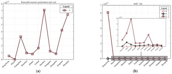 Based on the calculation results in Table 1, we can analyze the emergy flow and the three subsystems of the social–economic–natural system and the whole eco-economic system of the GBA city cluster.