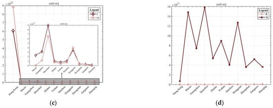The total consumption emergy U values of most cities in the GBA are in the 1022 sej to 1023 sej level, among which, Macau, Guangzhou, Shenzhen, Zhuhai, Foshan, Huizhou, and Dongguan are in the 1023 sej level and Zhongshan, Jiangmen, and Zhaoqing are in the 1022 sej level, except for Hong Kong, in which the U value is as high as 6.06 × 1025 sej, and the U value is higher than the other value. The U value is two ranks higher than the other 10 cities and cannot be compared on one graph; therefore, the data for the 10 cities except for Hong Kong are marked out in the left and middle graphs in Figure 3, but Hong Kong is still included in the numerical analysis. The reason for this is that the renewable resources and product emergy R of the GBA city cluster are only 1017 sej~1019 sej orders of magnitude different; the lowest in Macau is only 1017 sej, and Hong Kong and Macau are at 1018 sej, which are both lower in proportion. The emergy levels of nonrenewable resources and products N in order of quantity are Guangzhou, Hong Kong, Shenzhen, Dongguan, Jiangmen, Huizhou, Foshan, Zhongshan, Zhaoqing, Zhuhai, and Macau, most of which are 1022 sej; only Macau is the lowest at 1021 sej, while the import emergy I is 1022 sej~1023 sej in most cities except Hong Kong. The order of magnitude in Macau, Guangzhou, and Shenzhen reaches 1023 sej, while Hong Kong’s high import emergy reaches 1025 sej, indicating that the large amount of import emergy is crucial to the impact of Hong Kong’s ecological and economic system. The results show that Macau has the smallest area and the smallest population, but its U value exceeds those of Huizhou, Zhuhai, Foshan, Jiangmen, Zhongshan, and Zhaoqing. Overall, the emergy of renewable resources and products in the GBA city cluster is only 1019 sej orders of magnitude, which accounts for a very low proportion of the total consumed emergy, U. The difference between R and U is 3–7 orders of magnitude, among which Hong Kong, Macau, Shenzhen, and Dongguan have the largest differences, indicating that the structure of the total consumed emergy in the GBA city cluster is extremely unreasonable, relying more on the imported emergy and emergy of nonrenewable resources and products. Combining imports and exports into monetary flows for the analysis, Hong Kong’s import emergy is as high as 6.06 × 1025 sej, which is 2–3 orders of magnitude higher than that of other cities, with 31.6% of imported goods, 67.9% of actual foreign capital utilization, and 0.5% of inbound tourism income. On the other hand, Hong Kong’s export emergy is as high as 8.86 × 1025 sej, indicating that Hong Kong’s eco-economic system is highly dependent on import emergy and export emergy. The import emergy levels of Macau and Zhaoqing are both two orders of magnitude higher than the export emergy and have not reached equilibrium; the rest of the cities are of the same order of magnitude and are more balanced. The waste emergy levels of the 11 cities in the GBA are of the order of 1021 sej to 1022 sej, all greatly exceeding the renewable resource and product emergy levels; among them, Shenzhen, Guangzhou, and Dongguan exceed the extraordinary values, followed by Foshan, Hong Kong, and Jiangmen, indicating that the cities in the GBA have low utilization rates of renewable resources and recycling rates of waste (Table 1, Figure 3).