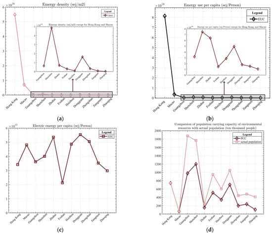 Social subsystem emergy index (a) Comparison of emergy density (ED) by city in the GBA; (b) Comparison of Emergy use per capita (EUC) by citys in the GBA; (c) Comparison of Electric emergy per capita (EEC) by citys in the GBA; (d) Comparison of Population carrying capacity of current environmental resources (ten thousand people) (PCC) and actual population by citys in the GBA.