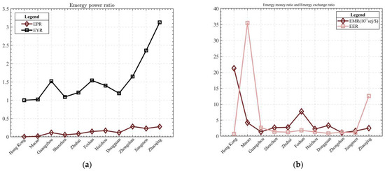 Economic subsystem emergy index (a) Comparison of Emergy power ratio (EPR) and Emergy yield ratio (EYR) by cities in the GBA; (b) Comparison of Emergy money ratio (EMR) and Emergy exchange ratio (EER) by cities in the GBA.