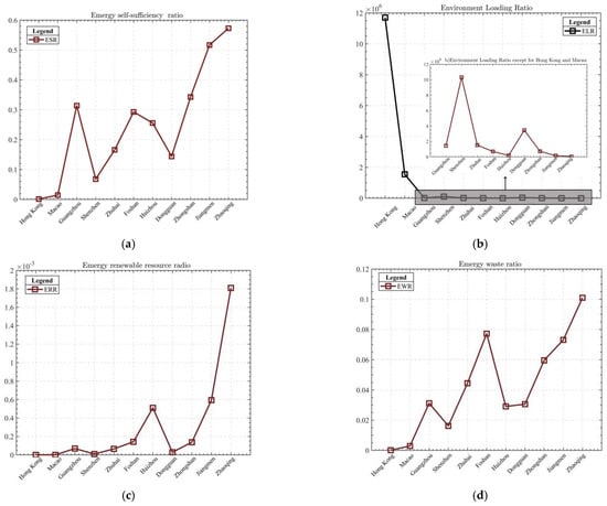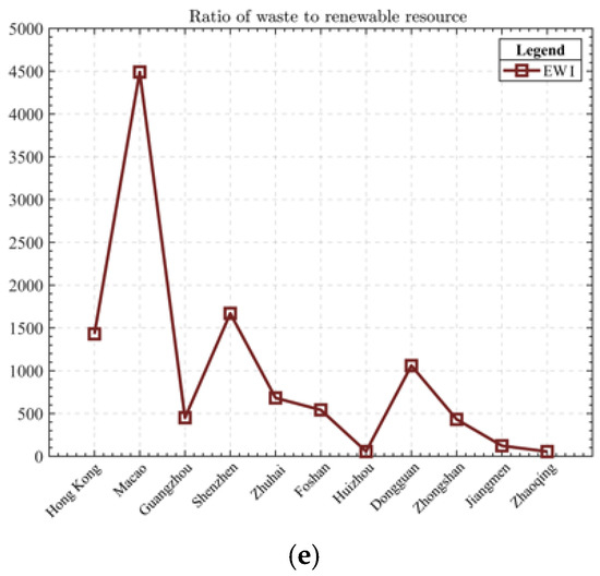 The highest emergy self-sufficiency ratio (ESR) values are for Zhaoqing and Jiangmen, both above 50%, followed by Zhongshan, Guangzhou, Foshan, Huizhou, Zhuhai, and Dongguan. Hong Kong and Macau have the lowest self-sufficiency rates, followed by Shenzhen, which is below 1%. The environmental loading rate (ELR) of the GBA city cluster is generally large because R is much lower than the sum of the emergy of nonrenewable resources and products and imports. The value for Hong Kong is as high as 1.17 × 107 and that for Macau is as high as 1.55 × 106, which are much higher than those of other cities and cannot be marked on one graph; the remaining cities in order of size are Shenzhen, Dongguan, Zhuhai, Guangzhou, Zhongshan, Foshan, Huizhou, Jiangmen, and Zhaoqing, with the lowest value of 5.51 × 102 being for Zhaoqing, indicating a relatively smaller environmental load, but relative to the national environmental load rate of 3.13 in 2016 [42], this is still too large. The ERR of the GBA city cluster is generally low, with Zhaoqing, Jiangmen, and Huizhou being relatively high and Hong Kong and Macau being the lowest and unable to be marked on a single map. The low W values for Hong Kong and Macau indicate that the above two cities have high waste disposal rates and recyclable utilization rates, while Zhaoqing is as high as 10.1%, Foshan is 7.7%, Jiangmen is 7.3%, and Zhongshan is 6.0%, which are ranked high, indicating that the above four cities have great potential for waste disposal and the development of a circular economy. The EWI is generally high, with Macau reaching 4.49 × 103, followed by Shenzhen, Hong Kong, and Dongguan, and the lowest, Zhaoqing, is at 5.56 × 10. This indicates that the W in the GBA city cluster greatly exceeds the ERR, and the recyclable value of the waste needs to be explored vigorously. Among them, Hong Kong and Macau, with their special geographical location and small area, have limited potential to improve the emergy of the R value (Table 1, Figure 6).