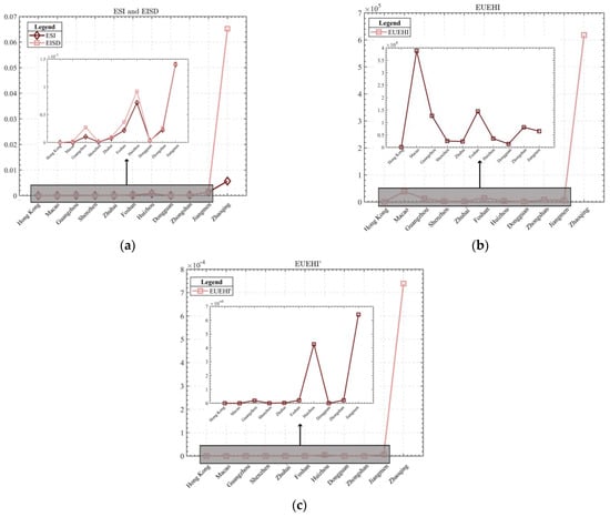 Emergy sustainability index and health emergy index of city eco-economic systems (a) Comparison of Emergy Sustainable index (ESI) and Emergy index for sustainable development(EISD) by cities in the GBA; (b) Comparison of Emergy-based urban ecosystem health index (EUEHI) by cities in the GBA; (c) Comparison of Modified emergy-based urban ecosystem health index (EUEHI’) by cities in the GBA.