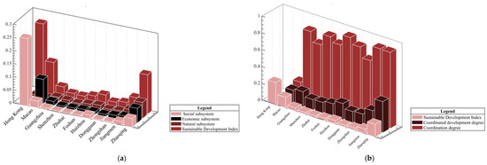 Eco-economic system and coordinated development of the GBA (a) Comparison of Social subsystem, Economic subsystem, Natural subsystem and Sustainable Development Index by cities in the GBA; (b) Comparison of Sustainable Development Index, Coordination degree and Coordinated development degree by cities in the GBA.