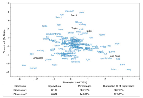 The results show the perspective of the overall formation of destination image to understand how travelers of different nationalities form impressions of different traveler cities. The distance between Tokyo, Seoul, and Taipei is relatively close on the map, which means that travelers have commented that the three cities have relatively similar travel experiences. Tokyo and Taipei are primarily related in the main, crowd, locals, and streets. It also means that there are local buildings in the three cities, and there are also several typical shops. However, they may be “crowded”, which is also in line with the description of the city image. For Seoul, it focuses on city descriptions related to history and towers. On behalf of travelers’ comments to deepen the description of historical impressions in the destination city and convey a dominant folk style [58]. In addition, Hong Kong and Singapore have their main characteristic attractions in the city; for example, the garden and zoo in Singapore, as the bus and tram mentioned in related comments in Hong Kong are relatively unique cities in the local area experience. It can also understand that the overall traveler-generated content consists of characteristic and unique topics.